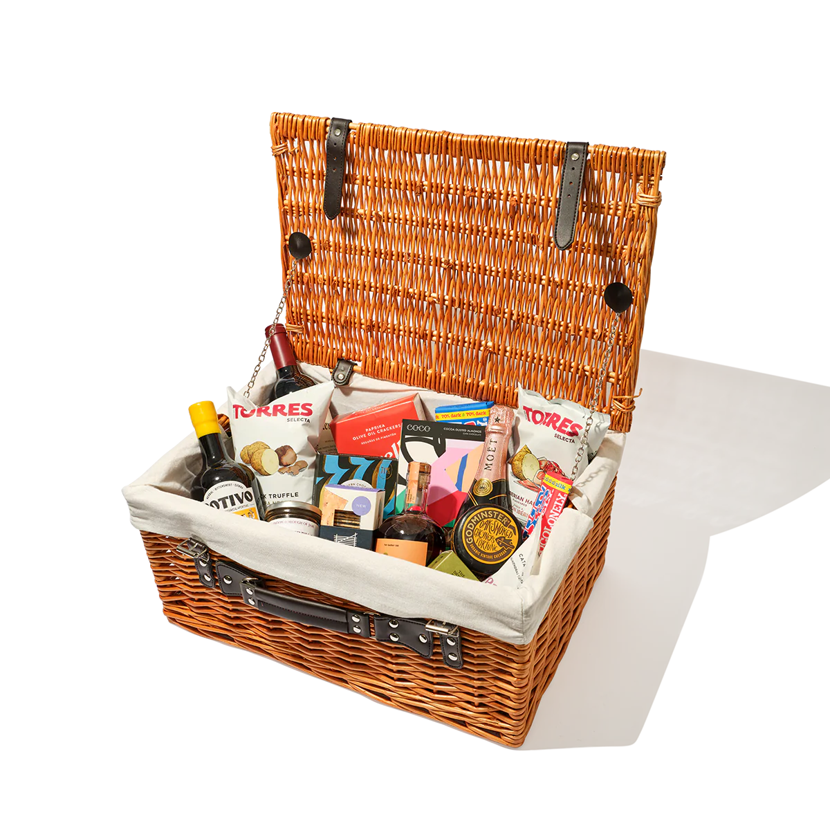 Personalise and fill your own hamper with a selection of premium snacks, ready-to-drink cocktails, cheese, crackers, and wine. Add luxurious extras like bottle openers, napkins and picnic blankets. Our team will expertly pack your items into the packaging of your choice, which can be embroidered with a name or special date.